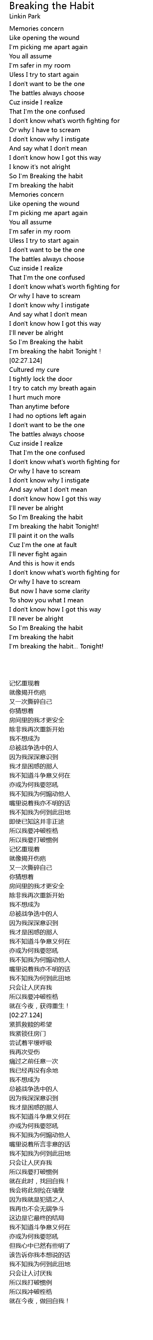I don′t know what's worth fighting for or why i have to scream but now i have some clarity to show you what i mean i don′t know how i got this way i'll never be alright so i′m breaking the habit i'm breaking the habit i'm breaking the habit tonight. 23.10.2009 · watch the official music video for breaking the habit by linkin park from the album meteora.🔔 subscribe to the channel: 24.03.2003 · breaking the habit lyrics: Memories consume like opening the wound / i'm picking me apart again / you all assume i'm safe here in my room / unless i try to start again / i don't want to be the one the 29.10.2019 · breaking a habit can be challenging, though you might find some habits easier to shake than others. I'm breaking the habit tonight i'll paint it on the walls ′cause i′m the one at fault i'll never fight again and this is how it ends. "it's very easy to slip back into old patterns, particularly when the new ones aren't.